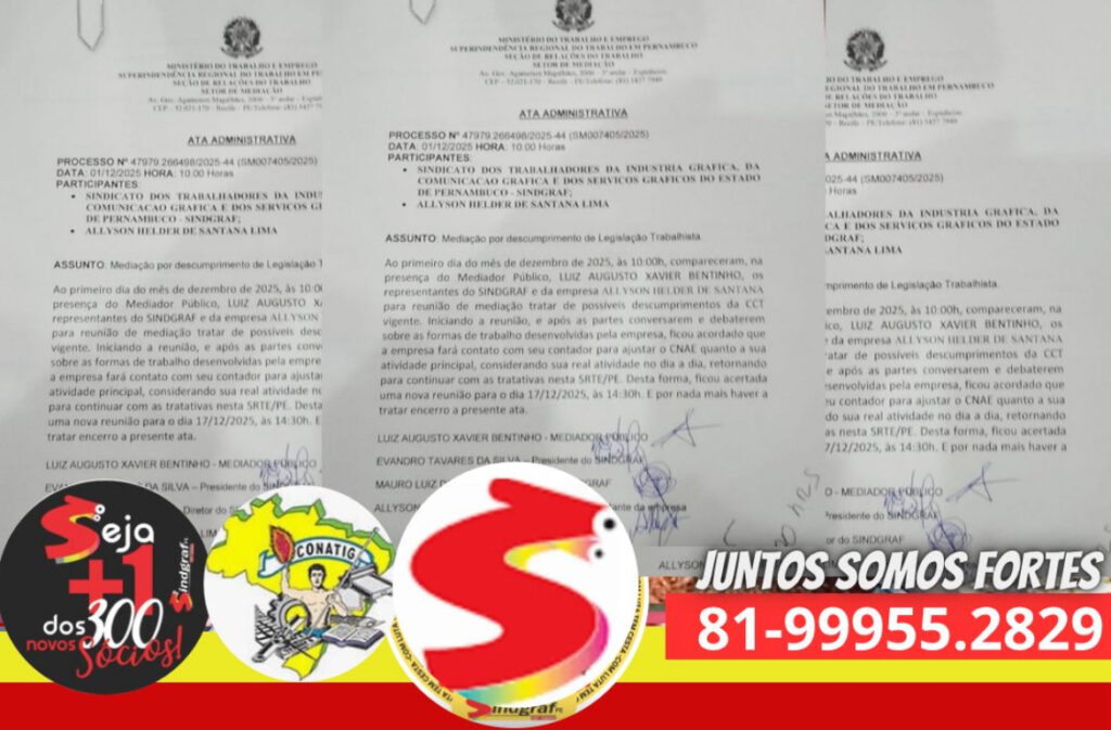O caso logo chegou ao MTE, que contou com o mediação do fiscal federal Luiz Augusto. Na ocasião, foi desconberta a irregularidade e feito o direcionamento para o devido enquadramento sindical e o compromisso do patrão de cumprir a CCT, esta que reúne 60 direitos acima da CLT em favor do salário, direitos e condições de trabalho do gráfico. Sejam fortes, sejam sócios. Sindicalizem-se!